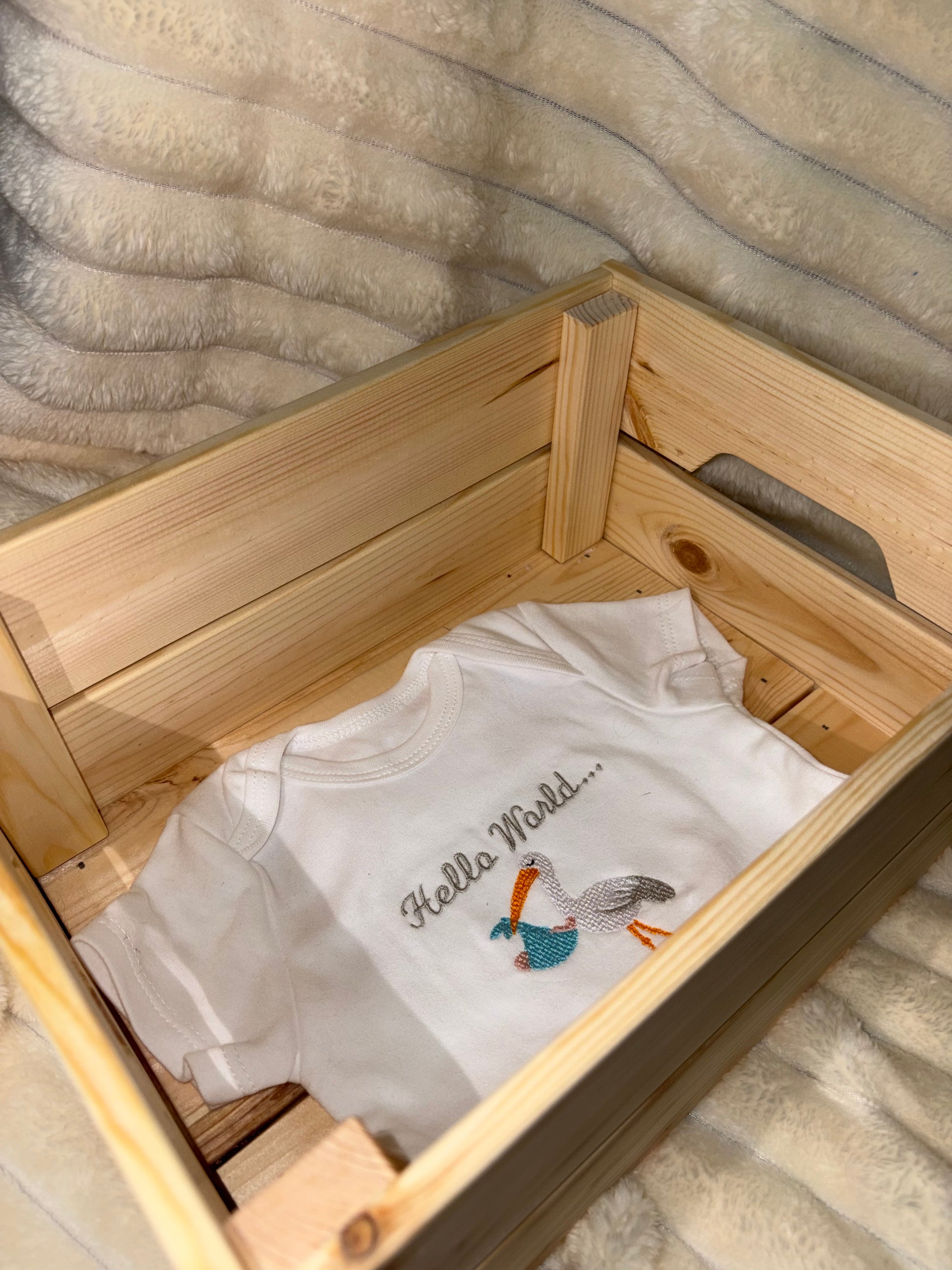 Celebrate your little one’s arrival in the sweetest way with this adorable 0–3 month baby vest, featuring a charming stork graphic and the phrase “Hello World.” Perfect for newborn photos, birth announcements, baby shower gifts, or as a special first outfit.