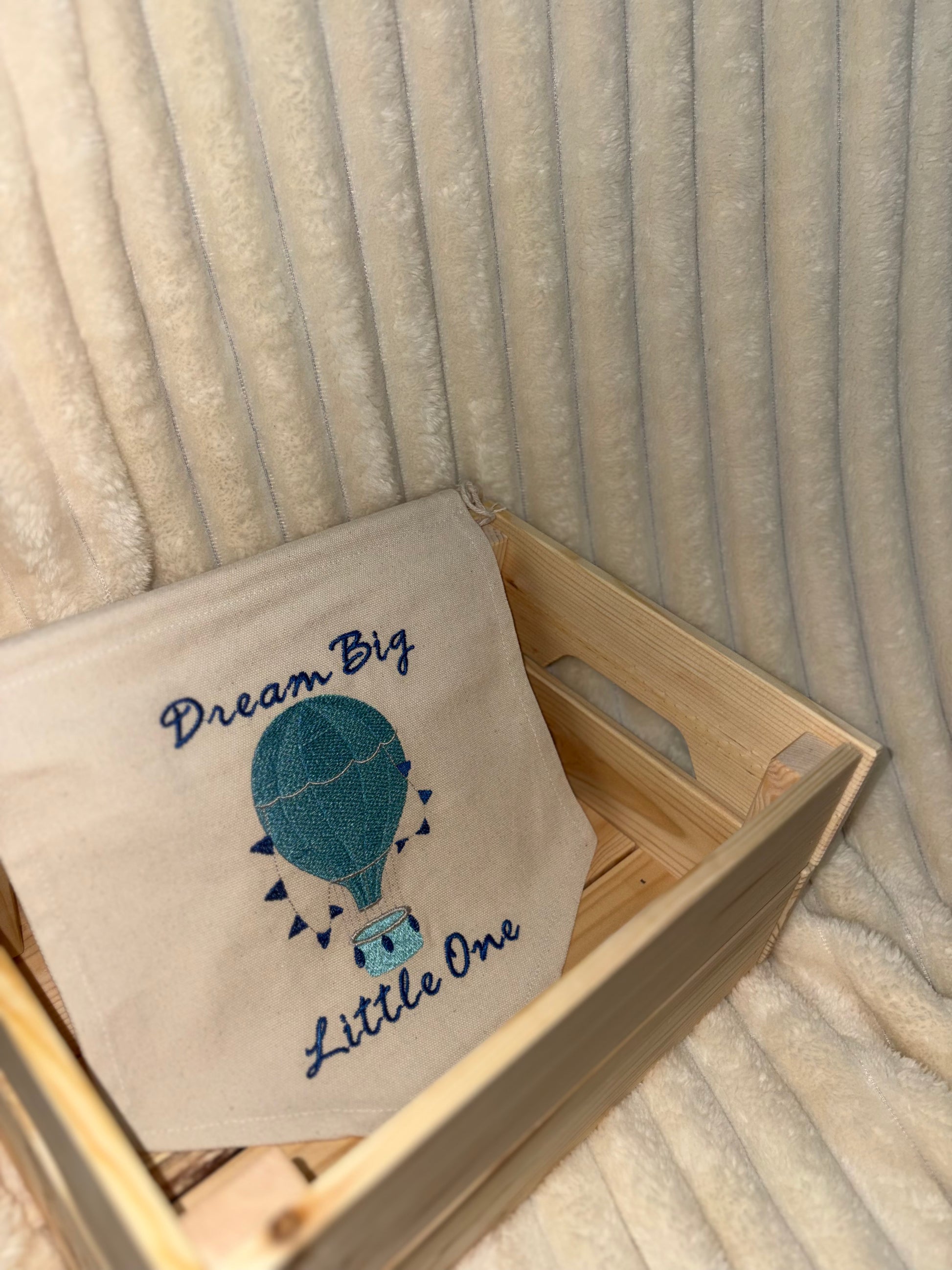 Add a touch of charm to your little one’s space with our beautifully embroidered Dream Big Little One banner. Featuring a soft neutral canvas backdrop and a detailed blue hot air balloon design, this piece brings a gentle, uplifting message to any nursery or playroom.