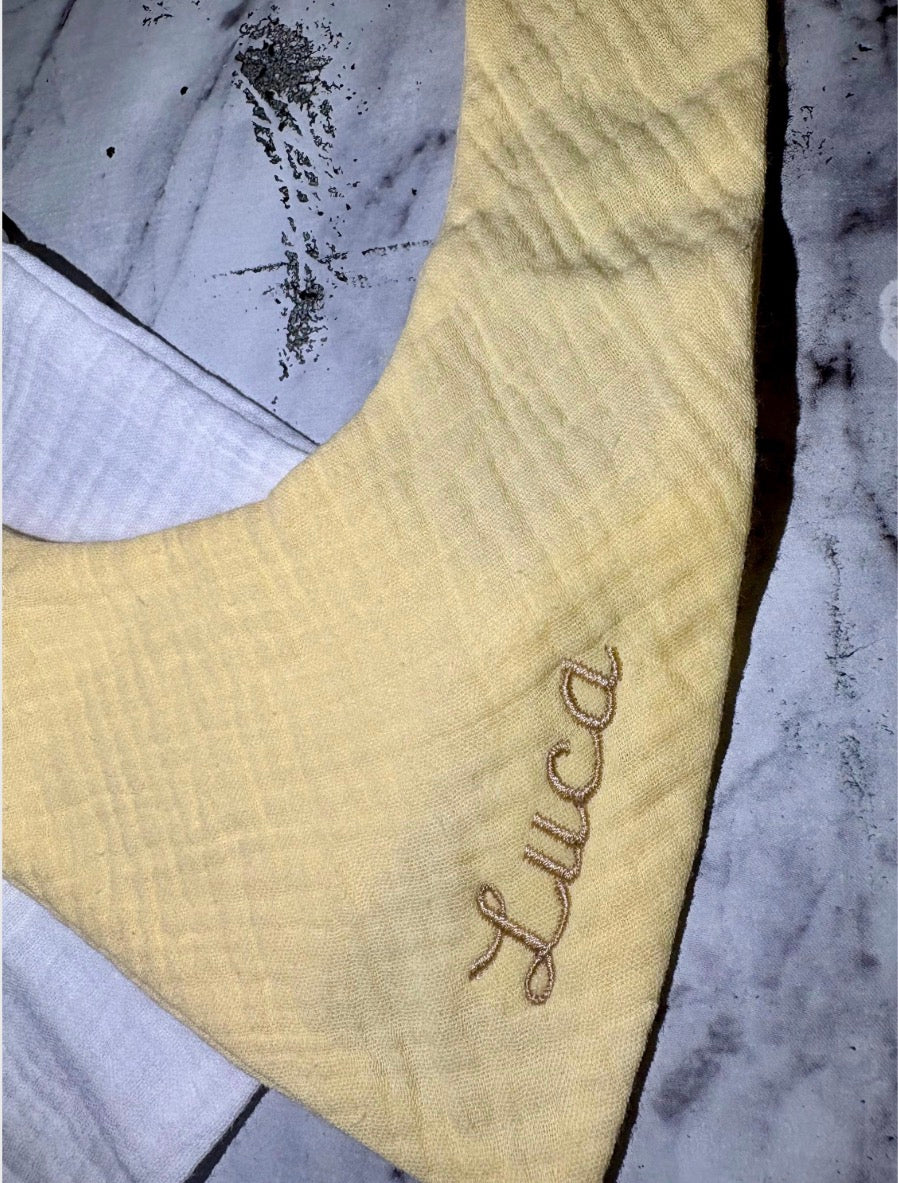 Practical meets stylish with this personalised embroidered bandana bib. Perfect for teething dribbles and feeding time, while staying cute and unique.