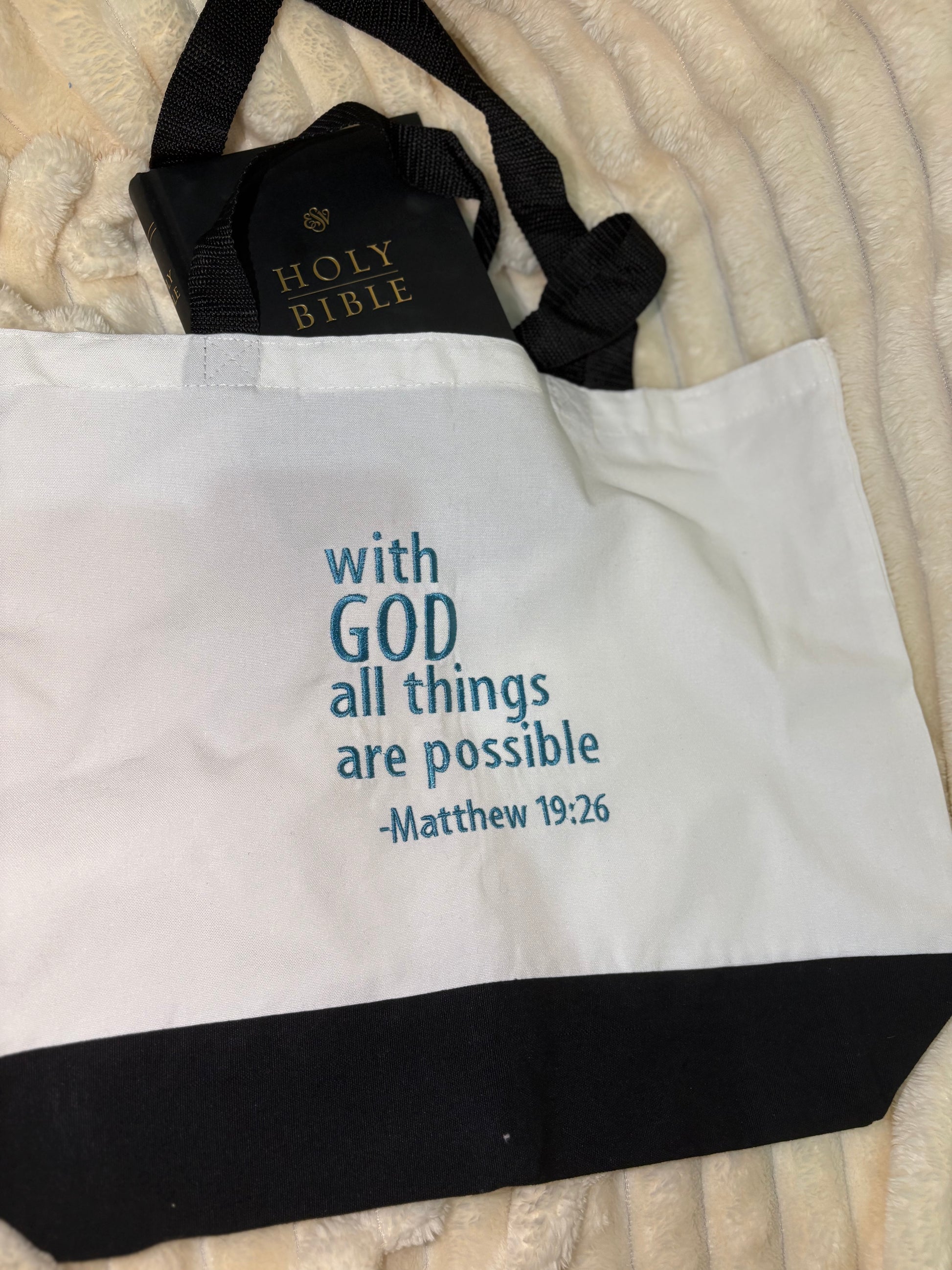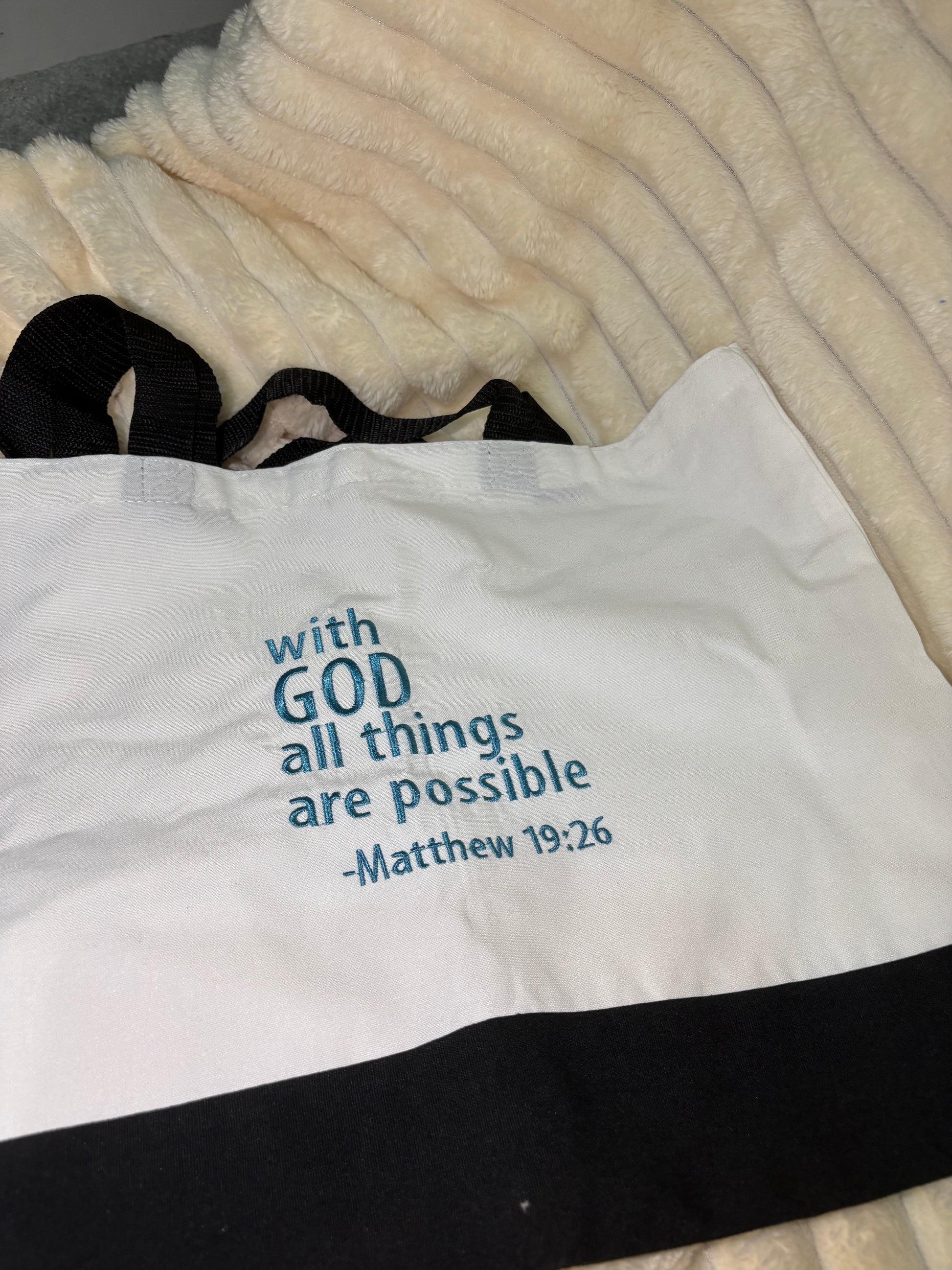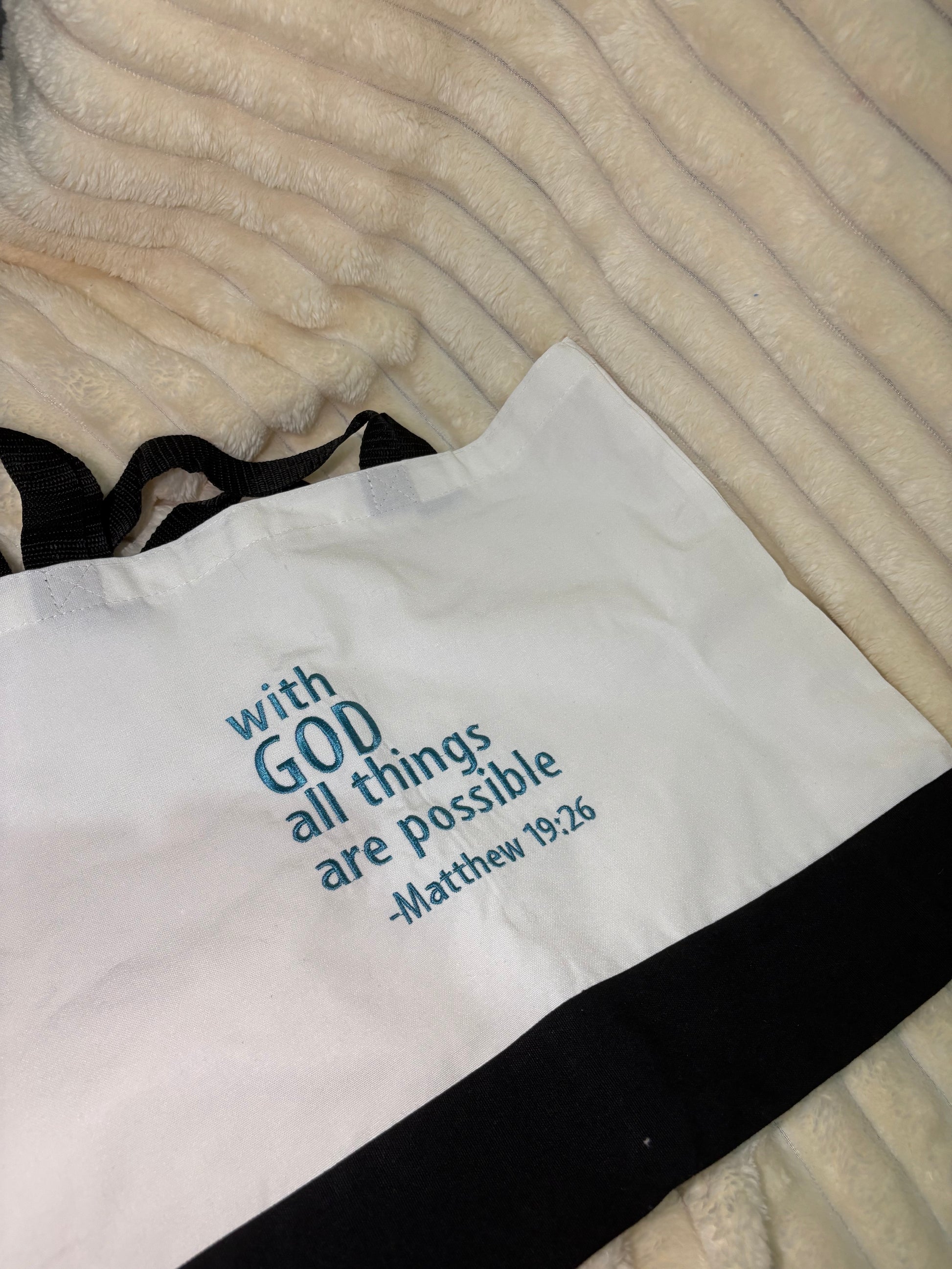 โ๏ธThe front of the tote is embroidered with the uplifting phrase 'With God all things are possible - Matthew 19:26' in a beautiful, calming blue colour. Its a daily reminder of strength, hope and faith wherever you go.